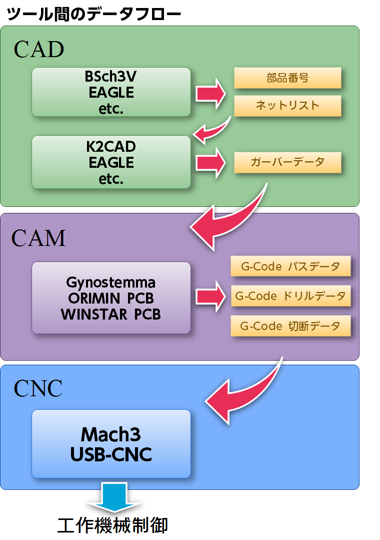 そのプリント基板設計データはデジタルデータですのでPC上のアプリで作成するのですが、実際に工作機械で製作をするためにいくつものアプリケーションと中間のデータが必要となってきます。